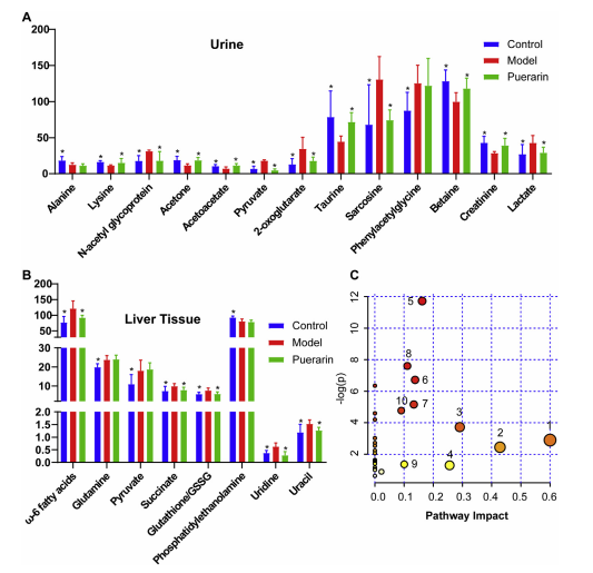 基于來自 OPLS-DA 模型的 VIP 值(VIP ≥ 1)和來自單變量統(tǒng)計(jì)分析的 P 值 (P < 0.05),8 和 13顯著改變與 NASH 相關(guān)的內(nèi)源性代謝物是分別被鑒定為肝組織和尿液中的潛在生物標(biāo)志物(圖 5A 和 B,以及表 1)。肝臟代謝特征NASH 模型小鼠的 w-6 脂肪酸水平升高,谷氨酰胺、丙酮酸、琥珀酸、谷胱甘肽/GSSG、尿苷和尿嘧啶,連同的磷脂酰乙醇胺水平降低。關(guān)于健康控制與對照組相比,模型組尿中n -乙酰糖蛋白(NAG)、丙酮酸、2-氧戊二酸、肌氨酸、苯乙酰甘氨酸、乳酸水平升高,丙氨酸、賴氨酸、丙酮、乙酰乙酸、?;撬帷⑻鸩藟A、肌酐水平降低。此外,除了肝臟組織中的谷氨酰胺、丙酮酸和磷脂酰乙醇胺(PE)以及尿液中的丙氨酸和苯乙酰甘氨酸外,所有與NASH相關(guān)的潛在生物標(biāo)志物均被葛根素顯著逆轉(zhuǎn)。