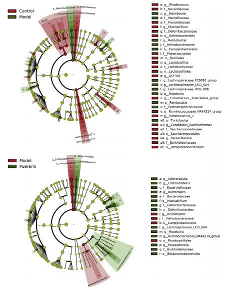 門水平的分類分析表明,厚壁菌門、擬桿菌門和放線菌門在所有類群的糞便微生物群落中占優(yōu)勢。與對照組相比,模型組的Epsilonbacteraeota水平較高,而葛根素處理可逆轉(zhuǎn)這一趨勢(圖7D)。采用LEfSe方法,篩選出LDA評分大于2.0的明顯改變的類群,以鑒定類群間(門到屬)的差異類群。如圖8和圖9所示,在對照組和模型組之間,模型和葛根素組之間,共發(fā)現(xiàn)了40和24個(gè)不同的細(xì)菌分類分支。有趣的是,在葛根素治療后,14種不同的細(xì)菌類群在NASH小鼠中顯示出相同的恢復(fù)正常水平的趨勢,包括p Epsilonbacteraeota, c Campylobacteria、o彎曲菌目、 f 螺桿菌科、 g幽門螺桿菌屬、p 脫鐵桿菌門、c 脫鐵桿菌、 o 脫鐵桿菌、 f 脫鐵桿菌科、g Mucispirillum、o Betaproteobacteriales、f burkholderaceae、g Parasutterella 和g瘤胃球菌科NK4A214組。值得一提的是,模型小鼠中氏菌屬的成員比對照組小鼠大,葛根素治療后進(jìn)一步擴(kuò)大。(字母 p、c、o、f 和 g 分別代表門、綱、目、科和屬)