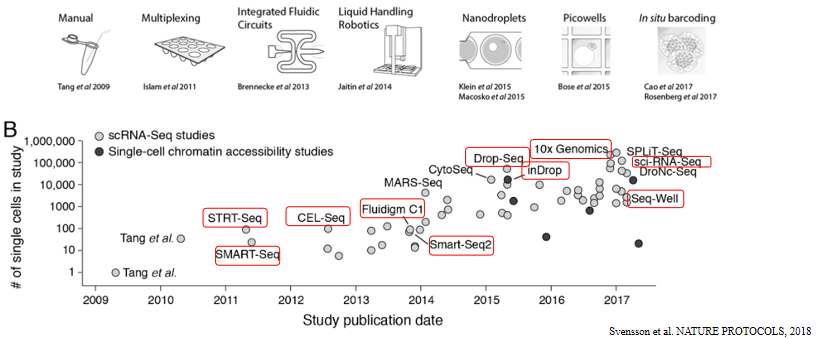 圖1 單細(xì)胞測序技術(shù)發(fā)展中通量的變化