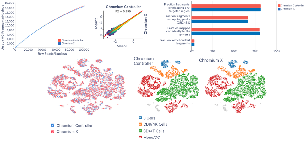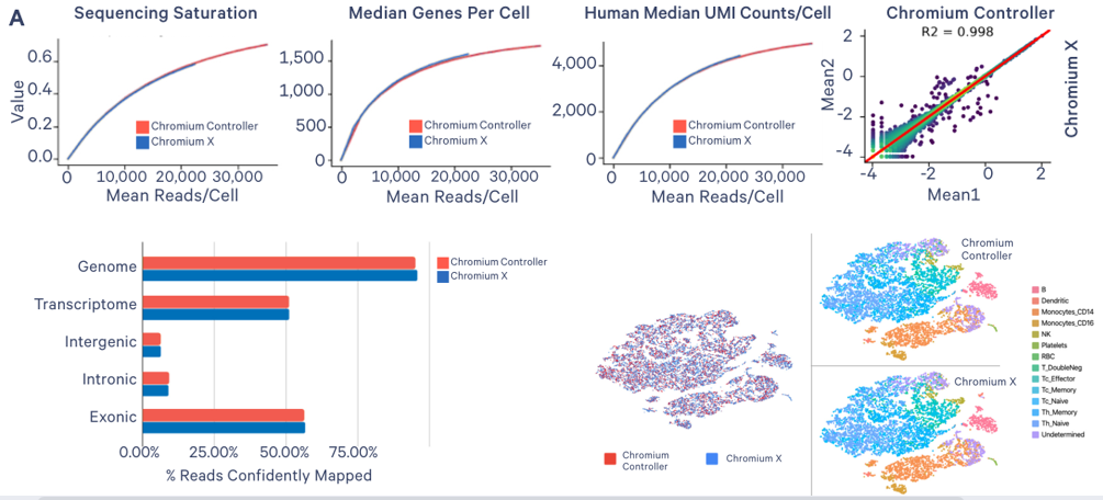 單細(xì)胞Chromium X系統(tǒng)可兼容單細(xì)胞系列產(chǎn)品,且與Controller系統(tǒng)數(shù)據(jù)保持極強(qiáng)的相關(guān)性。以下分別展示利用PBMCs捕獲10000個(gè)細(xì)胞/細(xì)胞核Chromium X和Controller系統(tǒng)的數(shù)據(jù)分析比較: