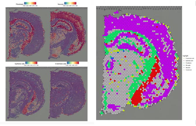 注:左圖展示單獨(dú)各個(gè)細(xì)胞類群在空間的分布情況,右圖為空間組織切片每個(gè)spot的細(xì)胞類型展示圖,不同顏色表示不同的細(xì)胞類型