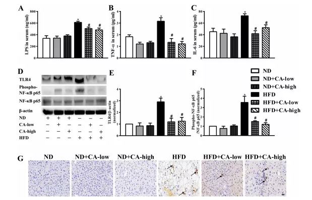 有報(bào)道稱,NAFLD的特征是腸道菌群改變、炎癥和腸道屏障破壞。肝組織炎癥被認(rèn)為是肝脂肪變性發(fā)展的驅(qū)動(dòng)因素,腸道源性脂多糖被認(rèn)為在肝臟炎癥中具有致病作用。最近的動(dòng)物實(shí)驗(yàn)研究關(guān)注了腸道菌群LPS在NAFLD發(fā)生中的作用。腸道源性LPS是革蘭氏陰性菌外膜的主要成分,通過TLR4信號(hào)通路和下游炎癥級(jí)聯(lián)反應(yīng)促進(jìn)炎癥反應(yīng)。有報(bào)道稱,在NAFLD模型中,與野生型小鼠相比,tlr4缺陷小鼠的肝損傷、炎癥和脂質(zhì)積累減少。此外,阻斷腸道菌群與宿主細(xì)胞之間的脂多糖- tlr4相互作用可以阻止高脂喂養(yǎng)小鼠NAFLD的啟動(dòng)和發(fā)展,這證實(shí)了脂多糖- tlr4通路在誘導(dǎo)NAFLD中具有非常重要的作用。與之前的研究結(jié)果一致,我們的研究表明,16周高脂飲食導(dǎo)致血清LPS和肝臟TLR4表達(dá)顯著增加,肝組織中磷酸化的NF-kB p65被激活,表明炎癥開始。同時(shí),高脂喂養(yǎng)小鼠血清TNF-a、IL-6水平升高,肝臟mpo陽性細(xì)胞浸潤。所有劑量的CA補(bǔ)充均顯著扭轉(zhuǎn)了上述現(xiàn)象;在添加ca的ND組中沒有觀察到顯著差異(圖4A-G)。