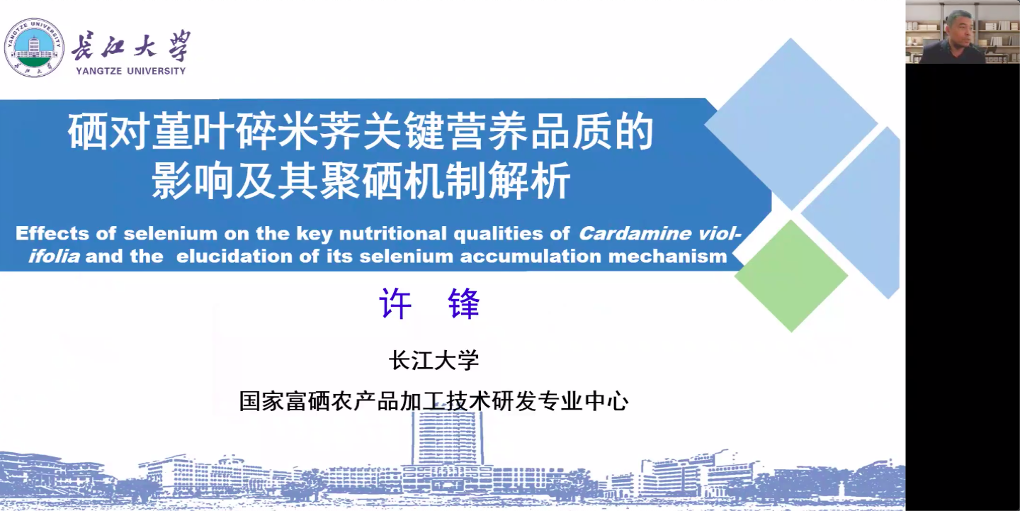 長江大學許鋒教授首先報告了外源硒處理下,堇葉碎米薺在幼苗期和成熟期都積累高含量的硒;然后講解了不同濃度的硒處理下,通過轉(zhuǎn)錄組、蛋白組和代謝組解析堇葉碎米薺的分子機制的研究工作,認為相關(guān)基因的表達變化減少了硫元素消耗,優(yōu)化了硫元素利用,可能是堇葉碎米薺耐硒的重要原因。