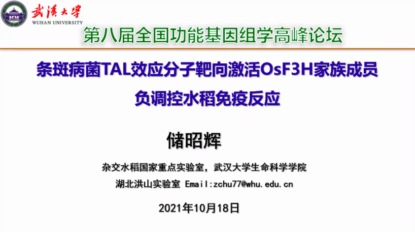 武漢大學生命科學學院儲昭輝教授報告了其團隊在水稻和條斑病菌互作上的研究進展,講解了HGA4菌株致病力更強的原因是其比RS105菌株包含更多TAL效應因子,并且表明Tal2b、Tal2c是兩個致病因子,它們通過分別靶向調(diào)控水稻中OsF3H03g、OsF3H04g基因進而調(diào)控水稻對條斑病的抗性,最后展示了對其進行的一系列功能驗證與分子機制研究。