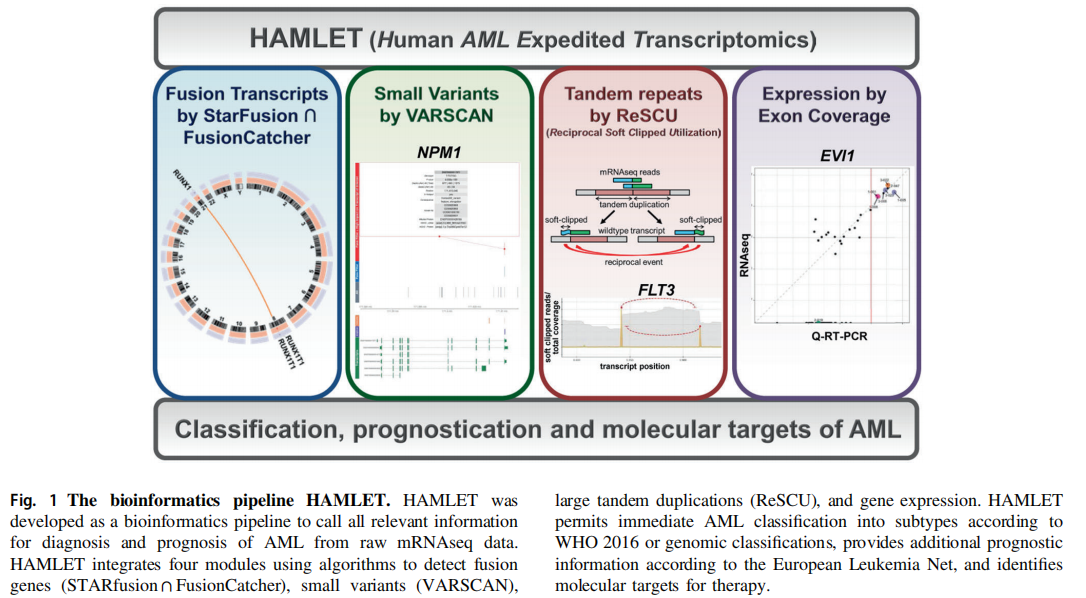 然而,急性髓細(xì)胞白血病的z確分類需要不同的技術(shù)來捕獲結(jié)構(gòu)多樣的基因突變,如較大的插入和缺失(indels)、融合基因和除小變異外的結(jié)構(gòu)性染色體變異。此外,結(jié)構(gòu)正?;虻谋磉_(dá)水平可對預(yù)后產(chǎn)生決定性影響。因此,在當(dāng)前的技術(shù)平臺下,急性髓細(xì)胞白血病診斷及風(fēng)險評估仍然繁瑣、貴,且不完整。為了解決這一需求,我們實(shí)施了全轉(zhuǎn)錄組RNA測序(mRNAseq),作為獲取與當(dāng)前和未來分類和風(fēng)險分類相關(guān)的所有遺傳信息的單一平臺。在這種診斷范式中,一個經(jīng)認(rèn)可的mRNAseq協(xié)議獲取診斷樣本的全面數(shù)據(jù)。對于單次運(yùn)行數(shù)據(jù)分析,我們開發(fā)了一個指定的集成生物信息管道(人類急性髓細(xì)胞白血病快速轉(zhuǎn)錄組學(xué)(HALLET);Fig. 1)。HAMLET具有靈活的適應(yīng)性和個性化,可以查詢一組選定基因的序列變異和表達(dá)水平,以及易位情況。