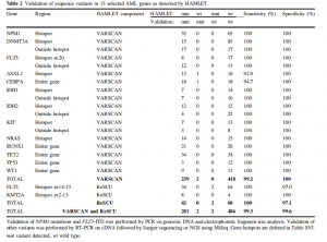 HAMLET的VARSCAN組件在13個AML基因中鑒定出246個小變異體。HAMLET對NPM1和DNMT3A的FLT3-ITD和熱點(diǎn)區(qū)域進(jìn)行了敏感性評估,對其余的418個被HAMLET稱為野生型的樣本進(jìn)行了靶向重測序反應(yīng)。VARSCAN只識別了七個相當(dāng)短的FLT3-34人中的ITDFLT3-ITD攜帶AML。在這種情況下,HAMLET都正確地識別了一個ASXL1(3-030)的30bp C末端插入和CEBPA (3-003)中一個N端易位。HAMLET檢測到的小變異體的總體類型和分布與在COSMIC中報告的分布非常一致。