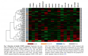 等位基因的CEBPA突變?yōu)楹诵驼5腁ML帶來了良好的預(yù)后并且將一個等位基因上編碼序列的第一個357 bp內(nèi)的N-末端移碼突變與c.834-1074之間的C-末端框內(nèi)插入或缺失相結(jié)合,從而破壞另一個等位基因上的DNA結(jié)合。通過Illumina平臺上通??色@得的reads長度來證明它們在相反染色體上的位置。然而,雙等位基因CEBPA突變與特定的基因表達(dá)譜有關(guān)?;趍RNAseq的基因表達(dá)譜顯示了特征性的雙等位基因CEBPA攜帶兩個樣本的所有四個急性髓系白血病樣本的突變相關(guān)特征CEBPA突變(2-009、2-039、2-045和3-003),包括其C端突變被HAMLET遺漏的病例3-003(圖3)。11例急性髓系白血病中,有一例CEBPA變異,一個病例(2-025)的特征性N-末端移碼突變與雙聚在一起CEBPA變異。因此,將變異檢測與基因表達(dá)譜結(jié)合分析,可以單獨(dú)解決變異檢測的不確定性。由于CEBPA 雙突變體的基因標(biāo)記不是定量的,所以尚未在HAMLET中實(shí)施臨床應(yīng)用。
