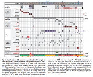 根據(jù)HAMLET和中期核型分析結(jié)果,99例病例可根據(jù)世衛(wèi)組織2016年和基因組分類進(jìn)行重新分類(圖6)。HAMLET信息促進(jìn)了6個案例的風(fēng)險重新評估,值得注意的是通過NUP98-NSD1融合而無分類明確病變的AML,或通過EVIl過表達(dá)而無inv(3)(q21q26)來分配風(fēng)險。