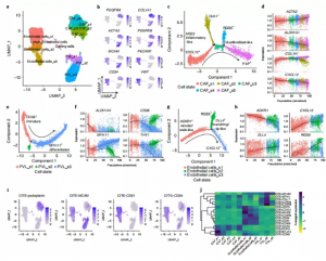 在基質(zhì)室中,作者鑒定了三種主要的細(xì)胞類型(圖5a,b)。Monocle2的偽時(shí)間軌跡分析揭示了5種CAF狀態(tài)。狀態(tài)1(s1)具有高表達(dá)的間充質(zhì)干細(xì)胞(MSCs)和炎性樣CAFs (iCAFs)特征。當(dāng)細(xì)胞向分化狀態(tài)s4和s5過(guò)渡時(shí),這些標(biāo)記物的表達(dá)減少,這種分化狀態(tài)通過(guò)增加ACTA2 (aSMA)、TAGLN、FAP和COL1A1的表達(dá)和富集ECM相關(guān)通路而類似于肌成纖維細(xì)胞樣CAF狀態(tài)。