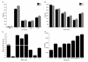 六個(gè)樣本的平均全長嵌合序列FLNC讀取率達(dá)到80.68%,平均獲得20360個(gè)非冗余轉(zhuǎn)錄本,平均N50長度和平均長度分別為1607bp和1378bp(表 1),這比之前獲得的根轉(zhuǎn)錄組數(shù)據(jù)要好。LR和HR組的平均AS事件分別為1408和1605。可變剪切分析結(jié)果顯示最常見的剪接類型是內(nèi)含子保留,LR組占45.41%,在HR組占有46.29%(圖1 A)?;コ馔怙@子最不常見,在LR和HR轉(zhuǎn)錄組中分別為0.86%和1.04%。APA分析顯示具有一個(gè)多聚(A)位點(diǎn)的基因數(shù)量最高,LR和HR組的平均基因數(shù)分別為3896和3733,具有五個(gè)多聚(A)位點(diǎn)的轉(zhuǎn)錄本數(shù)量最低,分別為1242和1386(圖1B)。文中共對(duì)54135個(gè)序列(77606351bp)進(jìn)行了SSR分析,包括16354個(gè)SSR序列和12855個(gè)含有SSR的序列。此外,單核苷酸、二核苷酸、三核苷酸、四核苷酸、五核苷酸和六核苷酸的數(shù)量分別為5522、4258、6139、176、44和215。其中,三核苷酸SSR的密度最高,為68(圖1C)。