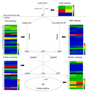 橡膠草(Taraxacum kok-saghyz,TKS)是一種小型、二倍體、有性生殖、蓮座狀多年生植物。它屬于菊科植物,起源于中國和哈薩克斯坦的天山山區(qū)。TKS的根部可以產(chǎn)生大量的天然橡膠(Natural rubber,NR)(高達(dá)20%干重),其分子量與巴西橡膠樹相似。TKS具有種植面積廣、NR含量和質(zhì)量高、易于種植和收獲、成熟時(shí)間短等優(yōu)點(diǎn),因此TKS是一種具有商業(yè)前景的優(yōu)質(zhì)NR替代源。然而,高雜合度和自交不親和導(dǎo)致的近交衰退是將TKS培育成NR生產(chǎn)作物的嚴(yán)重挑戰(zhàn)。更好地理解NR生物合成途徑和相關(guān)基因,以及TKS中相互競爭的代謝途徑,將有助于選擇合適的經(jīng)典或生物技術(shù)育種策略來改善TKS培育。迄今為止,許多與NR生物合成相關(guān)的基因已在TKS和其他NR生產(chǎn)植物中被鑒定。TKS基因組組裝于2017年構(gòu)建,鑒定出40個(gè)屬于MVA途徑的基因、19個(gè)參與起始劑合成的基因和20個(gè)參與NR合成的基因。然而,關(guān)于TKS中NR生物合成的分子機(jī)制的知識(shí)仍然是不完整和難以捉摸的。