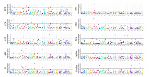 在牛的CNV變異研究中,利用已發(fā)表的1,116個(gè)牛中的鑒定的25,030個(gè)CNVs,基于不同性狀(功能、健康、繁殖等)的CNVs進(jìn)行GWAS,并評(píng)估其對(duì)養(yǎng)殖和育種實(shí)踐的影響,結(jié)果顯示,共有56個(gè)CNVs與8個(gè)表型性狀中的一個(gè)或多個(gè)顯著相關(guān),其中12號(hào)染色體上的3個(gè)CNVs與產(chǎn)脂性狀和乳腺性狀的顯著關(guān)聯(lián),這些CNVs位于23個(gè)不同的基因上,該研究是首次對(duì)如此大的瑞士奶牛樣本進(jìn)行基因組分析,將CNVs與繁殖、乳腺和健康性狀聯(lián)系起來(lái)。同樣,基于在528個(gè)荷斯坦奶牛中鑒定的197個(gè)CNVs(圖4),對(duì)473頭牛10個(gè)重要生產(chǎn)性狀進(jìn)行GWAS分析,共檢測(cè)到57個(gè)CNVs與至少一個(gè)性狀顯著相關(guān)(圖5),對(duì)這些CNVs與候選基因的潛在重疊進(jìn)行分析,預(yù)測(cè)得到一些表型相關(guān)的候選基因,該研究結(jié)果對(duì)荷斯坦奶牛的基因組鑒定了CNV,并提供了影響飼料效率和采食相關(guān)性狀變異的候選基因。