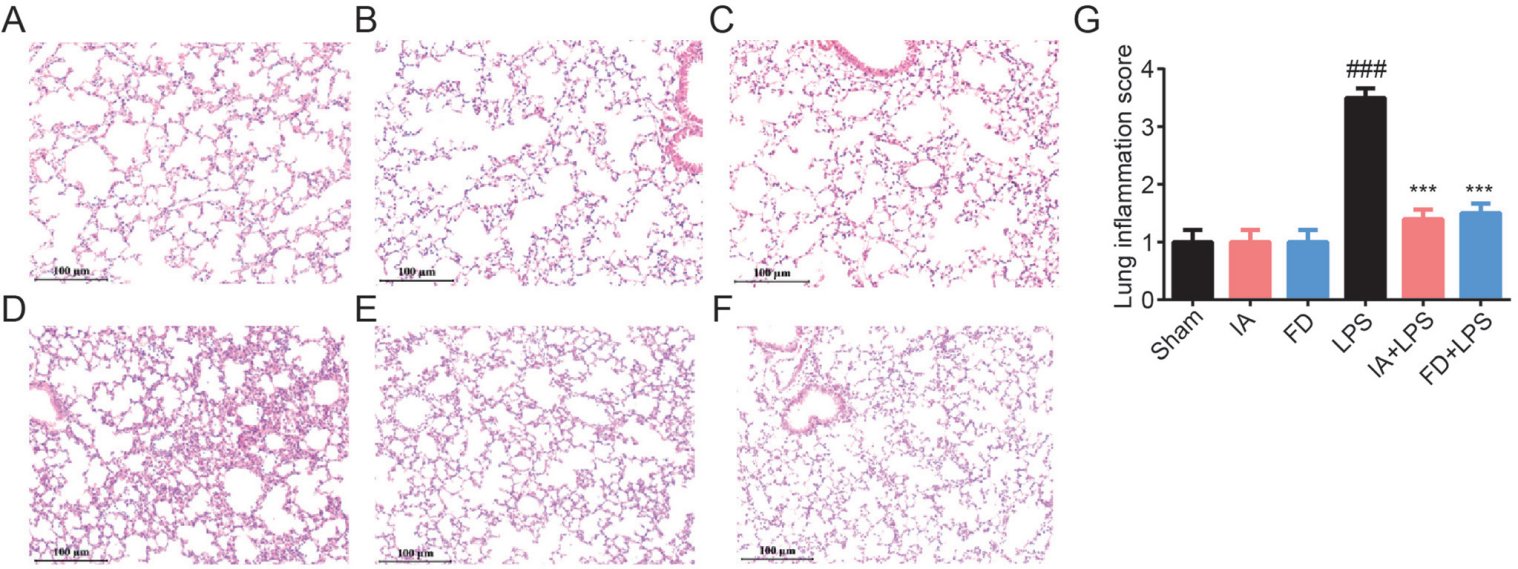 康普茶攝入降低LPS誘導(dǎo)膿毒癥小鼠炎癥因子水平、免疫細(xì)胞亞群水平??灯詹钄z入改變LPS誘導(dǎo)膿毒癥小鼠細(xì)胞因子的mRNA水平,肺組織病理學(xué)特征,康普茶攝入顯著降低了LPS誘導(dǎo)膿毒癥小鼠的肺部組織損傷程度??灯詹璧臄z入可以抑制LPS誘導(dǎo)膿毒癥小鼠的NF-κB激活。