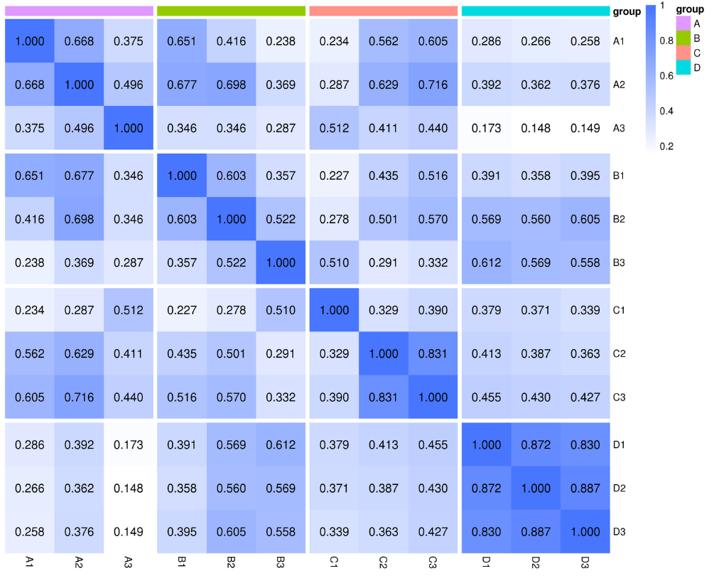 樣本相關(guān)性更改配色,并將組間隔開,更加直觀看出組內(nèi)重復性。