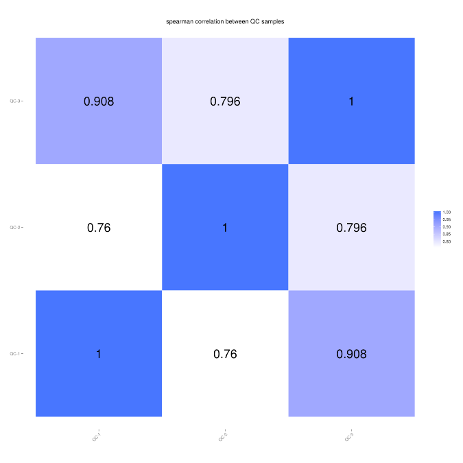 此外,新增QC樣本間的相關(guān)性, 通過計算QC樣品之間的相關(guān)性分析可以評估下機數(shù)據(jù)整體質(zhì)量,一般認為QC樣本間相關(guān)性>0.75時,數(shù)據(jù)質(zhì)量較為可靠。