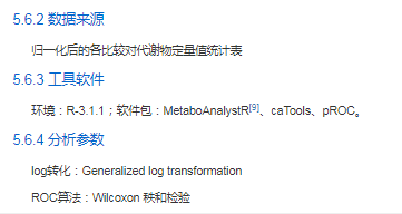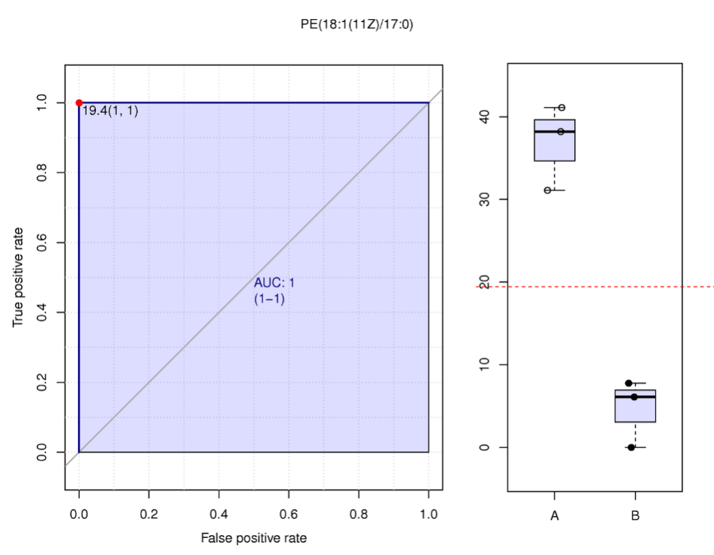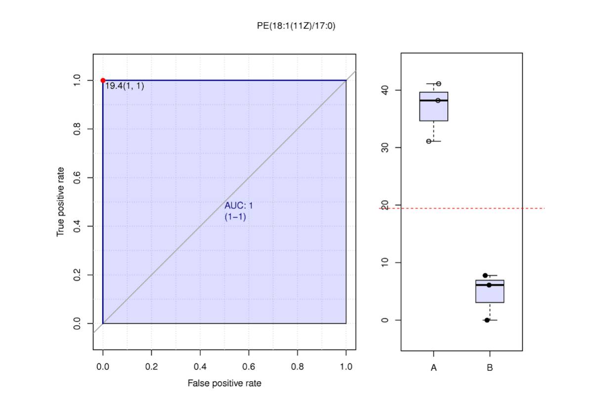 ROC曲線 (receiver operating characteristic curve) 是一種常用來篩選評估生物標記物的分析方法[9]。AUC (Area under the curve) 是衡量ROC曲線非常有用的度量。AUC始終在0.5(兩個類在統(tǒng)計上相同)和1.0(有一個閾值可以實現(xiàn)類之間的完美分離)之間,越接近1,物質(zhì)的在對照組和實驗組的分離就越明顯(即為潛在的生物標記物)。一般來說,組內(nèi)生物學重復>15時,ROC曲線才有足夠的點繪制折線,才會體現(xiàn)出較大意義。對篩選出的各組差異代謝物單獨進行ROC分析。