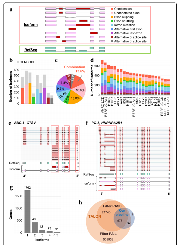 為了驗證計算的準確性,比較流程和TALON軟件檢測到的可變剪接。在計算流程中檢測到的725種轉錄本中有708種(98%)也在TALON中檢測到,其中676種(93%)成功通過了TALON的過濾條件(圖1h)。TALON檢測不到的17種亞型由reads糾錯工具校正。雖然僅在TALON中檢測到21,745種亞型,但99%的亞型被作者之前的過濾條件過濾掉的reads所覆蓋(歸因于不明確的比對或低表達水平,數據未顯示)。作者的過濾條件旨在避免假陽性檢測,并保留更高表達的轉錄本,這些轉錄本可以翻譯成新抗原;因此,作者的流程提取了比TALON提取的亞型更保守的亞型。