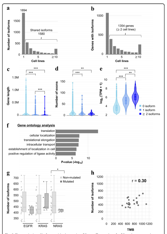為了表明富含同種亞型的基因,作者比較了有或無的同種亞型基因長度、外顯子數量和表達水平。與不含同種亞型的基因相比,含有至少一種同亞型的基因顯示出更短的序列長度,并且由較少數量的外顯子組成;然而,發(fā)現含有同種亞型的基因的表達水平明顯升高。作者還發(fā)現,同種亞型的多樣性與基因長度和表達水平有關。具有一種同種亞型的細胞系的基因顯示了具有兩種或多種同種亞型在基因長度和表達水平上的顯著差異。例如,在VMRC-LCD中,富含同種亞型的基因往往比只有一種同亞型的基因長度更短,表達量更高(圖2c–e)。