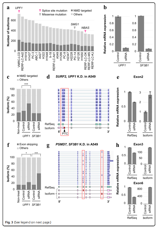 SF3B1是一種眾所周知的剪接因子,在多種疾病中發(fā)生突變,并導致異常剪接亞型的增加。作者通過SF3B1敲除評估剪接損傷的影響以及研究剪接因子的畸變是否影響轉錄本的產生。作者發(fā)現外顯子跳躍的比例顯著增加(圖3f),例如,PSMD7的外顯子3和6 在敲除后被改變(圖3g)。SF3B1-depleted的A549細胞中,外顯子跳躍亞型的表達PSMD7在中顯著增加,相反,RefSeq類型減少。為了確認剪接位點近端區(qū)域的共有序列,作者收集了僅在SF3B1在A549細胞中敲除檢測到的外顯子跳躍異構體。在這項分析中,作者用新的剪接連接的10 bp的區(qū)域,并跳過了外顯子。具有外顯子跳躍亞型的基因在翻譯和泛素-蛋白酶體途徑中顯示出顯著的富集,因此,這些因素的中斷可能會改變至少一些異常剪接亞型,并可能導致它們在肺癌細胞中的積累。