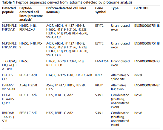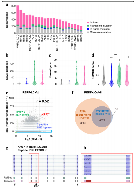 為了從實驗上驗證異常的轉錄本是否被翻譯成蛋白質,對11種細胞系(A427、A549、H1650、H2228、II-18、PC-9、RERF-LC-Ad1、RERF-LC-Ad2、RERF-LC-KJ、RERF-LC-MS和VMRC-LCD)采用了使用液相色譜結合串聯(lián)質譜(LC/MS/MS)對于多肽識別,作者基于每個細胞系的MinION數據定制了肽序列數據庫。如前所述,普通轉錄組測序由于其測序能力,顯示出比LC/MS/MS蛋白質組學更高的基因覆蓋率。通過液相色譜/質譜/蛋白質組學檢測的每個基因的肽數與通過轉錄組測序數據計算的TPM相關(r= 0.52,圖4e)而且LC/MS/MS蛋白質組學檢測到的大部分基因也被轉錄組測序覆蓋(圖4f)。作者成功地檢測到7個翻譯自異常剪接亞型特異性區(qū)域的多肽。例如,衍生自外顯子3中具有選擇性5’剪接的轉錄本的多肽KRT7存在于RERF-LC-Ad1(圖4g)。在GENCODE數據庫中沒有發(fā)現這種轉錄本,但是在ENST00000547613中觀察到了這種同中型特異性連接,其被認為是處理過的轉錄本。MinION也證實了在H1437、H2126和II-18中的表達(表1).此外,這種轉錄本有可能產生幾個新抗原,這些新抗原是由NetMHC預測的。這些結果表明,一些異常剪接亞型被真正翻譯成肽,并可能在癌癥中產生新抗原中發(fā)揮作用。