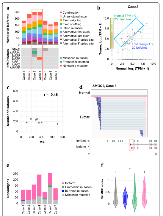 為了檢查體內癌細胞中是否也存在異常剪接轉錄本,作者接下來分析了臨床肺癌標本。應用與臨床樣本細胞系分析相同的分析方案,能夠識別每個患者的異常剪接亞型(圖5a)。作者選擇了在腫瘤樣本中表達水平比非腫瘤樣本高至少兩倍的轉錄本(圖5b)在所有臨床樣本中鑒定出982種富含癌癥的剪接亞型。其中,448種亞型在參考序列或基因代碼。異常亞型的數量和TMB之間沒有顯著的相關性(圖5c)。作為檢測到的轉錄本的一個例子,在SMOC2如圖1所示5d和僅在病例3的腫瘤中表達。類似于細胞系分析的結果,作者可以識別獨立剪接事件的幾種獨特組合模式,這些模式占這些未標記亞型的14.5%。還確定了保留在癌細胞中的潛在的NMD靶向亞型,這表明NMD機制在相應的癌癥中被破壞。值得注意的是,在病例3和4中,發(fā)現*大數量的潛在NMD靶向亞型在關鍵NMD因子中存在移碼或無義突變,UPF3B和SMG8(圖5a)。