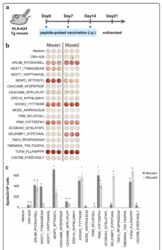 為了評估從異常剪接亞型和移碼突變中鑒定的肽的抗原性,作者根據圖6a所示的方案用候選肽免疫HLA-A24轉基因小鼠。作者根據人類白細胞抗原-α:24:02的網絡MHC評分選擇了17種候選肽(表2)。作者通過BLAST-P證實了該肽序列與人或小鼠蛋白質數據庫中的序列沒有相似性,最后一次接種疫苗一周后,作者從小鼠中分離出脾細胞,并對分離物進行酶聯(lián)免疫吸附斑點(ELISpot)分析。通過這樣做,作者試圖檢測新抗原特異性脾淋巴細胞反應。酶聯(lián)免疫吸附試驗結果顯示,17個多肽中有8個誘導顯著高的干擾素-γ產生(n= 2)與PBS組和單獨佐劑組相比(圖6b,c)。這些結果表明,來自剪接亞型和移碼突變的多肽可以通過與人類白細胞抗原的相互作用激活T細胞反應。