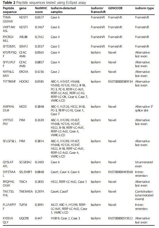 結果:對22組細胞系進行全長轉錄組測序,共鑒定出2021種新的剪接異構體。其中一些異構體的蛋白質表達通過蛋白質組分析進行驗證。無義介導的mRNA衰減因子(NMD)UPF1的降低和剪接因子SF3B1的減少增加了異常轉錄本的比例。NetMHC對每種HLA分子結合的親和力的評估顯示,一些亞型可能產生新抗原候選體,還在7個非小細胞肺癌標本中發(fā)現了剪接亞型。酶聯(lián)免疫吸附斑點試驗表明,大約一半的候選肽有可能通過與人類白細胞抗原分子的相互作用激活T細胞反應。大約一半的多肽通過與HLA分子的相互作用具有激活T細胞反應的潛力。最后,作者通過參考構建的目錄來估計癌癥基因組圖譜(TCGA)數據庫中的亞型數量,發(fā)現NMD因子的破壞與TCGA-Lung Adenocarcinoma數據集中發(fā)現的剪接亞型數量顯著相關。