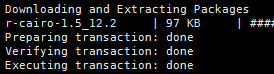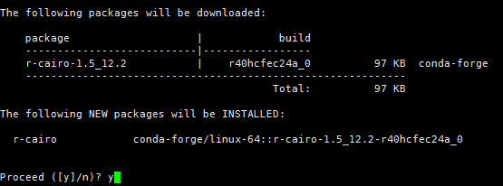 然后嘗試conda install -c conda-forge r-cairo(注意包的名字用小寫字母)來安裝。出來這個(gè)敲y,一般都能安裝成功。conda安裝R包首先要安裝有conda,然后激活conda環(huán)境,在命令行而不是交互界面去安裝。
