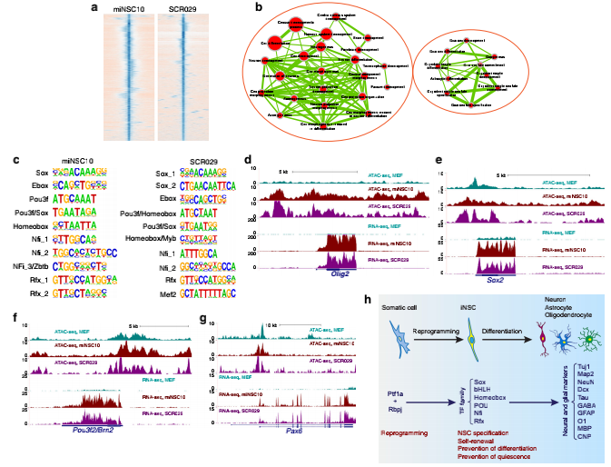 由體細(xì)胞重編程的誘導(dǎo)性神經(jīng)干細(xì)胞(induced neural stem cells,iNSC)在神經(jīng)疾病的細(xì)胞替代療法和體外建模中具有巨大的潛力。已有研究證明將成纖維細(xì)胞直接轉(zhuǎn)化成iNSC的方法依賴于幾個(gè)關(guān)鍵的神經(jīng)前體細(xì)胞轉(zhuǎn)錄因子(TF),這就提出了一個(gè)問題:這種直接的重編程是否可以由非神經(jīng)前體細(xì)胞調(diào)控TF來實(shí)現(xiàn)。通過RNA-seq和ATAC-seq分析結(jié)果,作者發(fā)現(xiàn)非神經(jīng)前體細(xì)胞調(diào)控TFPtf1a可以將小鼠和人的成纖維細(xì)胞直接重編程為具有分化出神經(jīng)元、星形膠質(zhì)細(xì)胞和少突膠質(zhì)細(xì)胞的潛能和自我更新能力的iNSC,并在移植后可以改善阿爾茨海默病小鼠模型的認(rèn)知功能障礙。相比于MEF,miNSC10和SCR029細(xì)胞,Ptf1a重編程的miNSC自我更新和維持所需要的Notch信號(hào)通路相關(guān)基因均顯著上調(diào),并且這些位點(diǎn)也顯示出差異的ATAC-seq圖譜。說明Ptf1a的重編程活性是通過與Rbpj結(jié)合的非Notch信號(hào)依賴途徑,來維持NSC特化、自我更新和體內(nèi)穩(wěn)態(tài)。同時(shí)作者的數(shù)據(jù)確定了這是一種用于研究和治療的更安全的非典型iNSC。