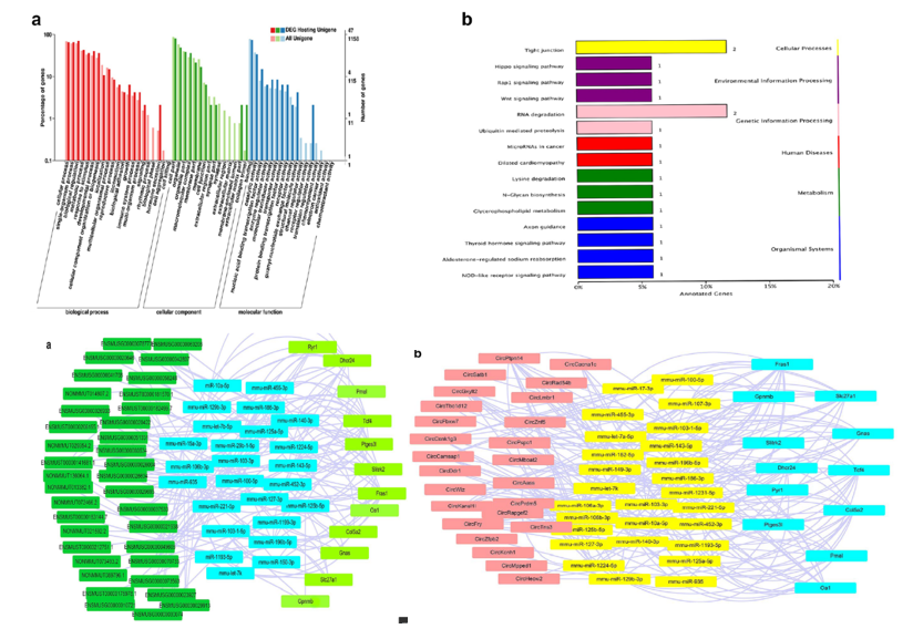2. 差異非編碼RNA靶基因預(yù)測(cè):GO term和pathway分析差異表達(dá)miRNA、lncRNA的靶基因以及circRNA的宿主基因,結(jié)果顯示circRNA的宿主基因主要富集在細(xì)胞過程和單個(gè)生物體過程中;miRNA的靶基因主要富集于染色質(zhì)結(jié)合和核內(nèi)鈣離子結(jié)合;lncRNA相關(guān)基因的功能是翻譯后修飾。