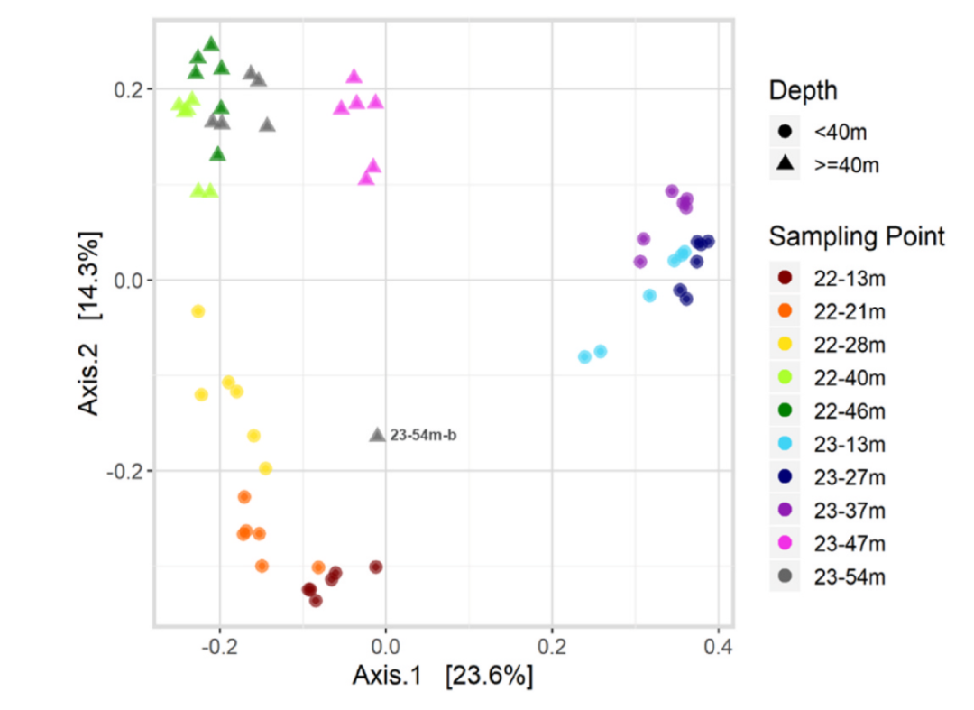地下水質(zhì)量對飲用水生產(chǎn)至關(guān)重要,但地下水資源正日益受到農(nóng)藥污染的威脅。由于殺蟲劑經(jīng)常出現(xiàn)在微型污染地濃度下,它們對微生物來說是沒有吸引力的碳源,通常會頑固地存在。探索用于飲用水生產(chǎn)的含水層中的微生物群落,是了解地下水中微污染物命運的重要第一步。在這項研究中,調(diào)查了用于飲用水生產(chǎn)的含水層中地下水地球化學(xué)、殺蟲劑脅迫和微生物群落之間的相互作用。首先,于荷蘭的兩口地下水監(jiān)測井采樣,同時在2014年、2015年和2016年進(jìn)行了采樣,并且在兩口井中,從13到54?m的五個離散深度對水進(jìn)行了采樣。為了研究上述科學(xué)問題,使用16S?rRNA基因測序和qPCR分析地球化學(xué)參數(shù)、農(nóng)藥濃度和微生物群落組成,其中,地下水地球化學(xué)在整個研究期間是穩(wěn)定的,農(nóng)藥在低濃度(μg?L-1范圍)下分布不均勻。通過計算Alpha多樣性指數(shù)PD?whole?tree,發(fā)現(xiàn)各個采樣點間的數(shù)據(jù)相似,但是隨著采樣點深度加深而變大。來自同一口井和深度的樣品緊密地組合在一起,這意味著微生物群落在時間上是穩(wěn)定的(圖2),同時,所有的樣品形成三組,第一組:根據(jù)深度(來自兩口井的大于40米的樣本歸為一組);第二組和第三組:井(來自小于40米的樣本分成兩個不同的組–每口井一個)分開。地球化學(xué)參數(shù)和較小程度的農(nóng)藥污染對微生物群落產(chǎn)生了選擇壓力,樣品中的微生物群落尤其受到DOC、硝酸鹽、鐵(II)和硫酸鹽豐度的影響。兩口井中的微生物群落在較深的含水層中顯示出相似的組成,在那里抽水會導(dǎo)致水平流動。這項研究提供了對塑造微生物群落組成的地下水參數(shù)的深入了解。這些信息有助于未來實施修復(fù)技術(shù),以保證安全的飲用水生產(chǎn)。