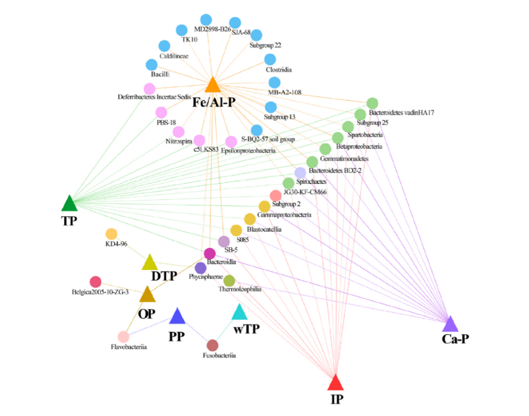 圖4?網(wǎng)絡(luò)分析顯示35個細(xì)菌群落在級別上(用圓圈表示)和8個不同的磷形式(用三角形表示)之間有很強的相關(guān)性