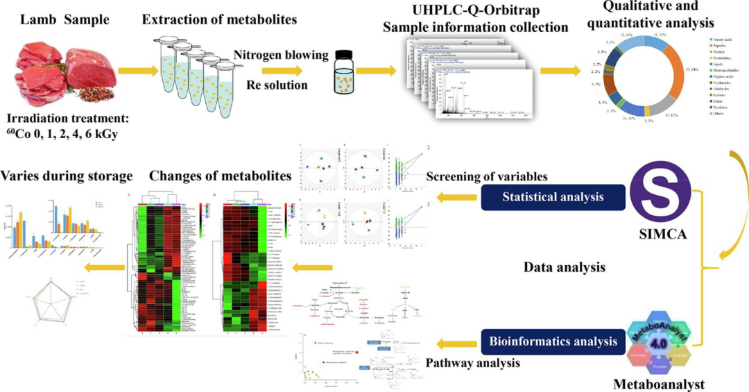 輻照是一種高效滅菌方法,對(duì)肉類(lèi)保存具有重要作用。本研究基于定性非靶向?HPLC-Orbitrap?代謝組學(xué)方法,旨在估計(jì)輻照雞肉、火雞和混合(雞肉、火雞和豬肉)絞肉的全局代謝組譜變化,以評(píng)估可能存在的食品安全關(guān)于代謝組改變的問(wèn)題。通過(guò)LC-MS共鑒定了?402?種代謝物,并且所有三種基質(zhì)都表現(xiàn)出特定的代謝組譜,該譜組不受應(yīng)用五種不同輻照強(qiáng)度水平的顯著影響。特別是,所有三個(gè)肉類(lèi)類(lèi)別都顯示出以下共同特征: