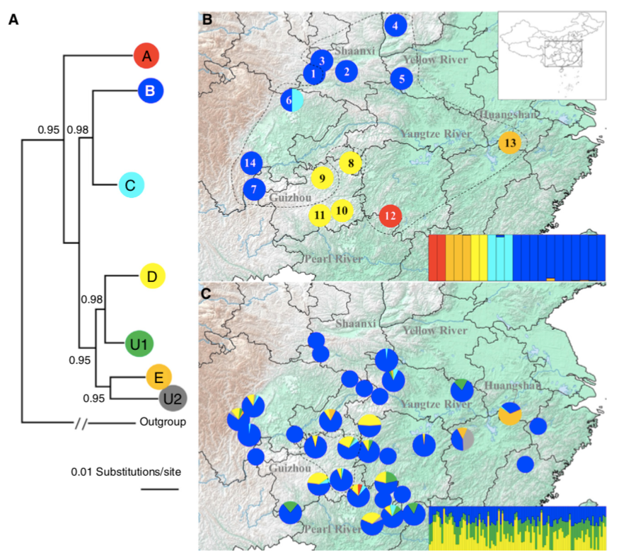此外,2018年發(fā)表在Current Biology(IF = 10.814)的中國大鯢研究中,研究人員收集了70個野生地采集的1034個個體,通過SLAF-seq對中國大鯢的分類進行研究?;?3,159個SNPs位點和mtDNA的野生采集個體的遺傳多樣性分析顯示:中國大鯢至少具有5個明顯的分群(圖3)。此外還有一些未被鑒定的種(圖3:U1,U2)。譜系A-E,在4.71-10.25Mya間開始分化,并與河流排水相關?;谵r(nóng)場育種的中國大鯢個體的mtDNA和微衛(wèi)星序列的遺傳多樣性分析顯示其具有廣泛的遺傳混合,特別是,漸滲種類B來自陜西黃河流域。通過農(nóng)業(yè)混種導致了分化于四百萬年前的中國大鯢發(fā)生了雜交,這種雜交方式不足為奇,另有研究報道過在日本本土,中國大鯢的引種和日本大鯢發(fā)生了雜交。