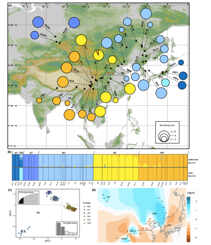 在今年3月份發(fā)表在Molecular Ecology(IF = 6.185)上的題為“Ecological adaptation shaped the genetic structure of homoploid ferns against strong dispersal capacity”的研究中,中國科學院植物植物研究所張憲春研究組利用SLAF-seq對中華蹄蓋蕨復合群Athyrium sinense complex進行簡化基因組測序,獲取全基因組范圍內(nèi)有代表性的SNP變異位點,對其群體遺傳結(jié)構(gòu)進行分析,揭示了蕨類植物孢子強擴散能力下生態(tài)適應塑造的遺傳分化格局。