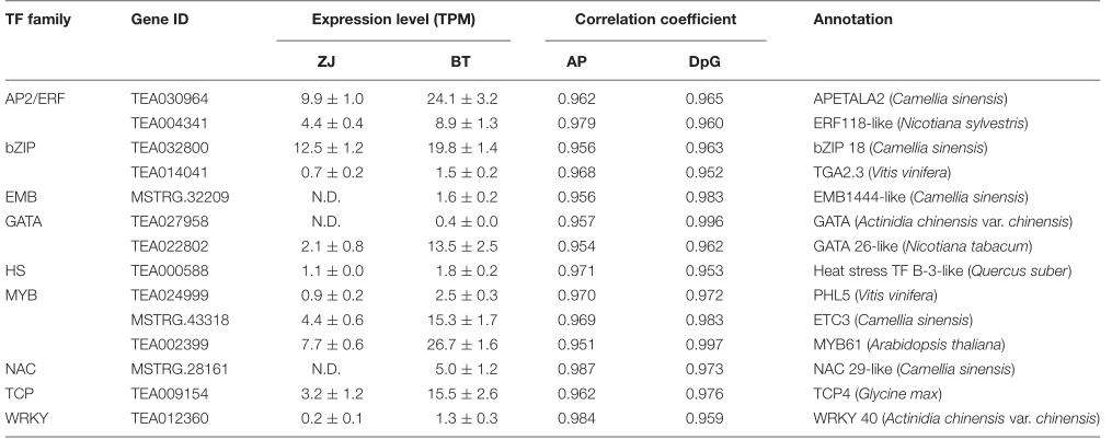 上述結(jié)果表明,在紫色花朵中,具有特征的揮發(fā)性和非揮發(fā)性BPs分別為AP和DpG。計算了Ps和TFs之間的皮爾遜相關(guān)系數(shù),發(fā)現(xiàn)這兩個茶葉品種之間存在顯著差異。AP和DpG的14個TF的相關(guān)系數(shù)大于0.95(表1)。他們屬于AP2/ERF、bZIP、EMP、GATA、HS、MYB、NAC、TCP和WRKY家族,在紫色花種分別高出1.6–6.7倍,其中MYB、AP2/ERF、bZIP、TCP和GATA的表達水平高。
