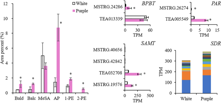然后,作者研究了四種直接合成苯甲酸芐酯、MeSA、2-PE和AP的基因,分別是苯甲醇鄰苯甲酰轉(zhuǎn)移酶(BPBT;KO id為K19861)、水楊酸羧基甲基轉(zhuǎn)移酶(SAMT;KO id為K21483)、苯乙醛還原酶(PAR)和短鏈脫氫酶/還原酶(SDR)。他們都在紫色茶花中高表達。通過柱狀圖分析了兩個品種之間存在顯著差異的22個SDR基因成員。在紫色茶花中,22個SDR基因的總表達量高出1.3倍,其中表達水平高的成員(TEA025281)也是如此。BPBT和PAR表達水平較低,分別為15和5倍。兩個SAMT成員在茶花中高度誘導(dǎo),在紫色花瓣中高出3-4倍。這些結(jié)果證明紫茶花中揮發(fā)性BPs的生物合成能力更強。