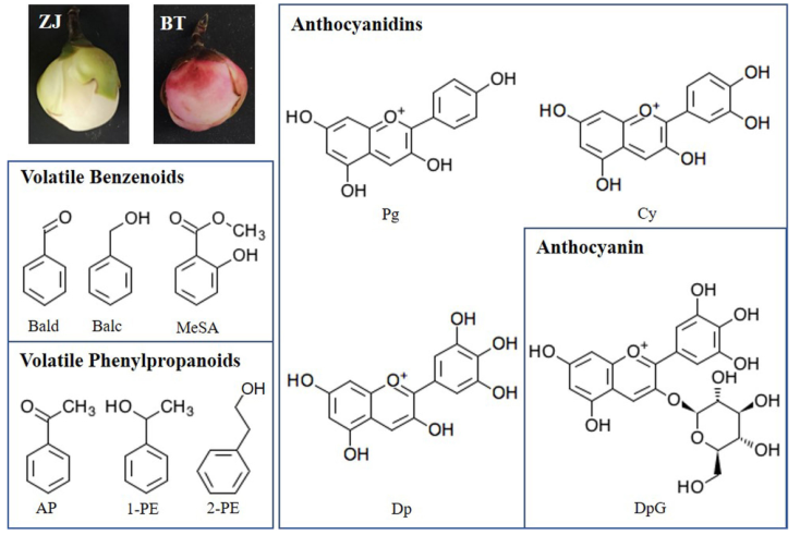 在這項研究中,為了研究揮發(fā)性和非揮發(fā)性BPs對紫色茶花的氣味和顏色的作用,在白色(ZJ品種)和紫色(BT品種)茶花瓣中測定了BP型香氣和花青素(圖1),確定了生物合成和花青素運輸相關(guān)途徑中的基因表達譜,并分析了調(diào)節(jié)ZJ和BT之間氣味和顏色變化可能的TFs。
