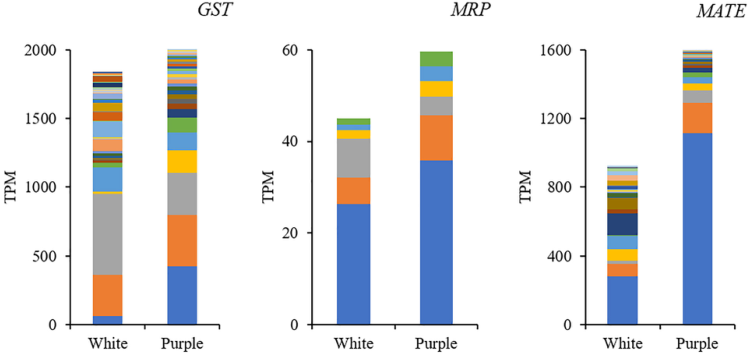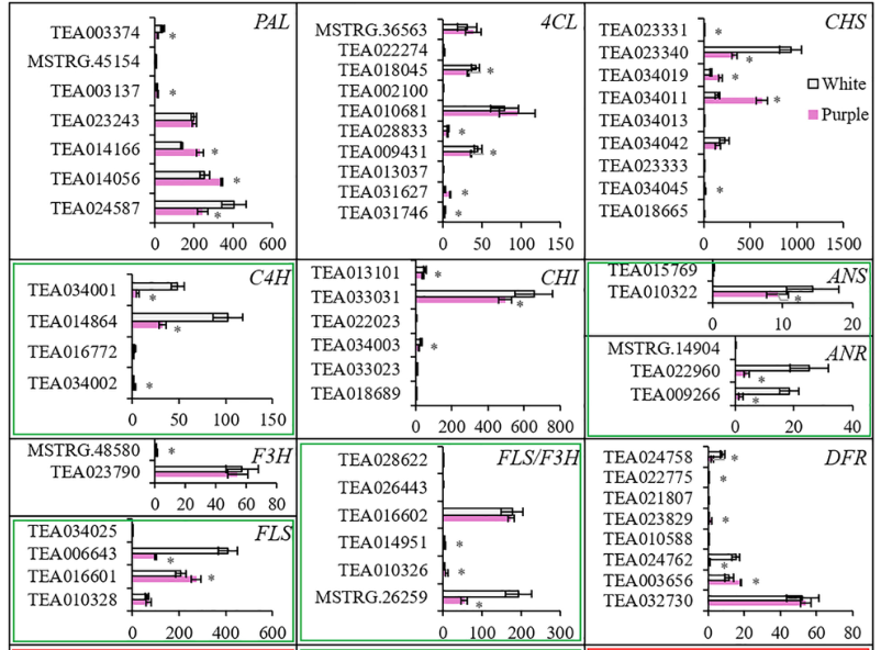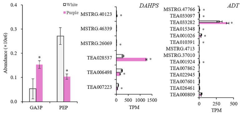 為了進一步揭示兩個茶樹品種之間BPs的不同合成機制,檢測了上游化合物和基因(圖5)。在紫色花瓣中,3-磷酸甘油醛(GA3P)增加了2.9倍,而磷酸烯醇式丙酮酸(PEP)僅為白色花瓣的38%,這表明紫色花瓣中的碳代謝被促進,但它可能不會進入苯丙氨酸的下游代謝。PEP的降低可能是由于高度誘導(dǎo)的3-脫氧-D-阿拉伯庚糖酸7-磷酸合成酶(DAHPS)所致。在紫色花瓣中,DAHPS基因的主要成員TEA028537的表達量高出4.6倍。芳醇脫水酶/預(yù)苯酸脫水酶(ADT)催化芳醇生成苯丙氨酸。它的主要成員TEA033282在紫色花瓣中略微升高,高出1.3倍。此外,合成的花青素在顯示顏色之前需要運輸?shù)揭号葜?,該過程與谷胱甘肽S-轉(zhuǎn)移酶(GST)、多藥耐藥相關(guān)蛋白(MRP)以及多藥和毒素擠壓(MATE)有關(guān)。把這些顯著差異基因的表達量加起來,發(fā)現(xiàn)紫色花瓣的總表達量都較高,分別高出1.1, 1. 3和1.7倍。紫色花瓣中這三個基因的主要成員(TEA015341、TEA001531和TEA006958),表達量分別高出6.9, 1. 4,和3.9倍。