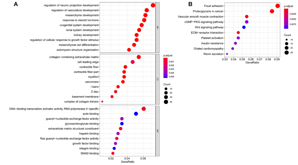 作者使用了677個(gè)共有差異mRNAs,通過(guò)GO和KEGG通路富集分析來(lái)鑒定關(guān)鍵miRNAs的潛在功能。作者在GO分析中獲得了836個(gè)結(jié)果,其中圖4A顯示了來(lái)自生物過(guò)程、細(xì)胞成分和分子功能的前10個(gè)結(jié)果。一些結(jié)果與腫瘤的發(fā)生和進(jìn)展有關(guān),包括調(diào)節(jié)細(xì)胞對(duì)生長(zhǎng)因子刺激的反應(yīng),含膠原蛋白的細(xì)胞外基質(zhì)和基底膜等。此外,從KEGG通路分析中注釋了48條信號(hào)通路,前10個(gè)結(jié)果如圖4B所示。這些通路大多數(shù)與腫瘤的發(fā)生和發(fā)展相關(guān),包括焦點(diǎn)粘連、癌癥中的蛋白多糖、細(xì)胞外基質(zhì)-受體相互作用和Wnt信號(hào)通路。其中粘著斑通路富集最為顯著。