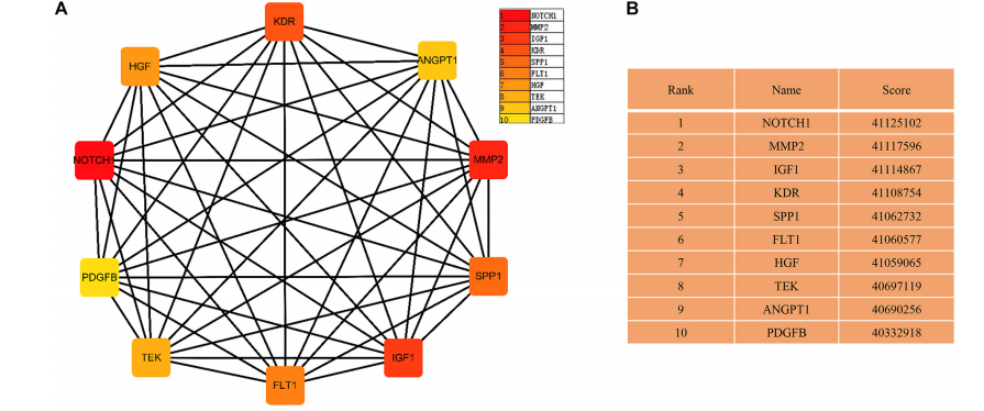 PPI網(wǎng)絡(luò)從677個(gè)共有差異mRNA中識(shí)別出597個(gè)mRNA,其中有2246條邊相互關(guān)聯(lián)(圖5)。使用cytoHubba插件MCC排名確定了前10個(gè)關(guān)鍵mRNA,包括神經(jīng)源性位點(diǎn)notch同源蛋白1(NOTCH1)、基質(zhì)金屬蛋白酶2(MMP2)、胰島素樣生長(zhǎng)因子1(IGF1)、激酶插入結(jié)構(gòu)域受體(KDR)、分泌磷蛋白1(SPP1)、血管內(nèi)皮生長(zhǎng)因子受體1(FLT1)、肝細(xì)胞生長(zhǎng)因子(HGF)、血管生成素1受體(TEK),血管生成素-1基因(ANGPT1)和血小板源性生長(zhǎng)因子(圖6)。通過(guò)生存分析的計(jì)算,作者使用GEPIA進(jìn)一步驗(yàn)證了這些關(guān)鍵的mRNA。在這里,只有兩個(gè)(SPP1和HGF)被鑒定為關(guān)鍵基因,并與生存相關(guān)(圖7)。生存分析顯示,在LUAD中,SPP1的表達(dá)與生存呈負(fù)相關(guān),而HGF與生存呈正相關(guān)(圖7)。此外,SPP1和HGF均在黏附信號(hào)通路中富集。