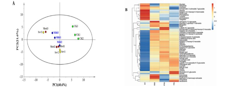 Fig. 3 對(duì)不同程度油斑病的青檸皮次級(jí)代謝產(chǎn)物和三種初級(jí)代謝產(chǎn)物(酪氨酸、亮氨酸和苯丙氨酸)進(jìn)行主成分分析(A)和層次聚類(lèi)分析(B)
