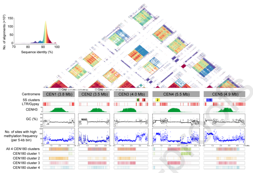 ② ?在雜合度極低的物種中,往往會(huì)追求更完美和更準(zhǔn)確的組裝,尤其是解析其上高度復(fù)雜的著絲粒位點(diǎn),植物的著絲粒位于染色體的異染色質(zhì)區(qū)域,該區(qū)域由多種類型的DNA重復(fù)元件組成,主要包括衛(wèi)星DNA序列、單一拷貝DNA、反轉(zhuǎn)錄元件、轉(zhuǎn)座子和端粒類重復(fù)序列等。人類基因組完成圖(Nurk S et al., Science.2022; Altemose N et al., Science.2022; Gershman A et al., Science.2022)、擬南芥T2T基因組(Naish M et al., Science.2021;Wang B et al., GPB.2021)等研究均說明,對(duì)著絲粒區(qū)的甲基化等表觀調(diào)控進(jìn)行解析,具有重要的研究意義。例如,擬南芥T2T基因組研究中,作者發(fā)現(xiàn)著絲粒的DNA甲基化高于著絲粒周圍區(qū)域,但在著絲粒內(nèi)部,CENH3信號(hào)富集的CEN180高度串聯(lián)重復(fù)區(qū)域呈現(xiàn)低甲基化狀態(tài)(Wang B et al., GPB.2021)。