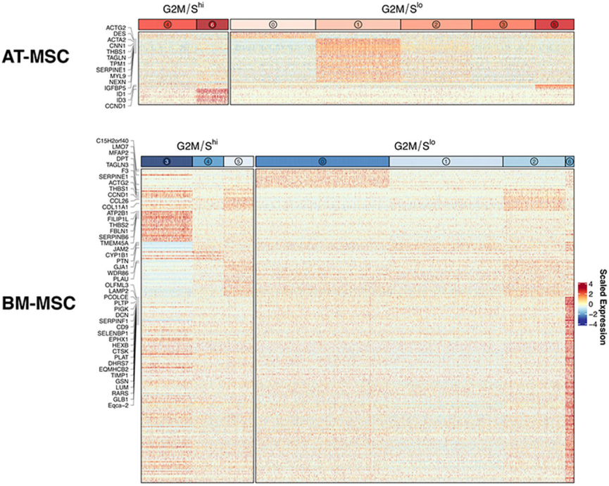 無監(jiān)督聚類分別將AT來源的MSCs、BM來源的MSCs和PBM來源的MSCs聚類為7,7,10個(gè)clusters(Fig.?4a)。根據(jù)作者最初的分析中,細(xì)胞周期相關(guān)基因的表達(dá)對聚類有很大的影響(Kowalczyk?et?al.,?2015)。在本研究中作者也觀察到一些明顯由與增殖一致的基因表達(dá)模式定義的簇(Fig.?4b),因此,作者進(jìn)一步分析了G1?clusters和G2M/S?clusters,以確定不同細(xì)胞周期分類的簇間差異基因表達(dá)模式。在這種分組策略下,差異基因表達(dá)測試顯示來自AT、BM和PB衍生的MSCs中存在明顯的源內(nèi)轉(zhuǎn)錄異質(zhì)性,盡管在AT來源的MSCs中差異較小,差異表達(dá)基因?(DEGs)?以熱圖的形式進(jìn)行展示?(Fig.?5)。為了檢查檢測到的clusters的假定生物學(xué)功能,作者對每個(gè)組織中的每個(gè)cluster進(jìn)行了GO功能富集分析,其中BM來源的MSCs中排名最靠前的是cluster2的細(xì)胞遷移和cluster3中的慢性炎癥反應(yīng),PB來源的MSCs中排名靠前的是cluster4的蛋白組折疊和cluster6中的趨化性調(diào)節(jié),AT來源的MSCs沒有檢測到任何顯著富集的GO?terms,表明檢測到的clusters之間的轉(zhuǎn)錄差異極小。