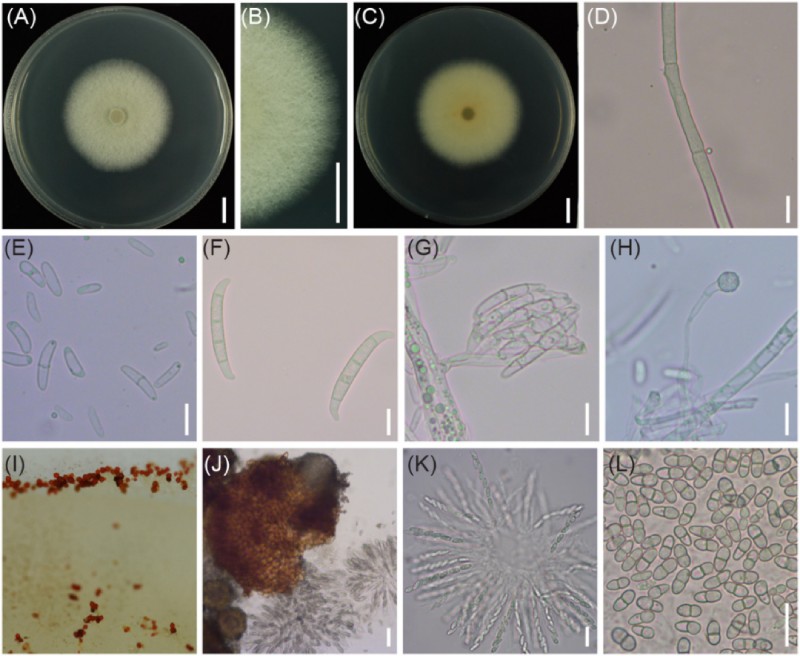 圖2 CRI 24-3在PSA上的形態(tài)特征。 (A 到 C) 培養(yǎng) 4 天后從表面和背面的菌落。標(biāo)尺 = 1 厘米。(D) 氣生菌絲。(E) 小分生孢子。(F) 大分生孢子。(G) 假頭中的分生孢子。(H) 衣藻。標(biāo)尺 = 10 微米。(I)Perithecia。(J) 放大的外皮層。標(biāo)尺 = 50 微米。(K) 子囊軸承 (L) 八個子囊孢子。標(biāo)尺 = 20 微米。