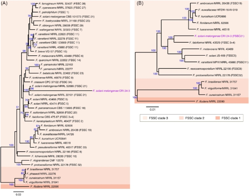 圖 4 CRI 24-3 和其他植物病原鐮刀菌的系統(tǒng)發(fā)育分析。 從?(A) ITS、RPB2 和 TEF 1-α 的串聯(lián)序列和 (B) 由 16 個 FSSC 物種共享的 1,544 個單拷貝同源基因的組合序列推斷出的 ML 樹。?引導(dǎo)值(藍(lán)色)表示相關(guān)菌株聚集在一起的分支百分比。?括號中的阿拉伯?dāng)?shù)字區(qū)分了 FSSC 進(jìn)化枝 3 中系統(tǒng)發(fā)育不同的物種。