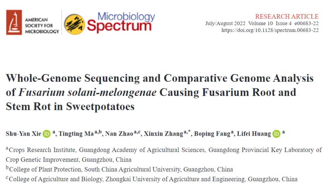近日, Microbiology Spectrum(IF 9.0431)在線發(fā)表了廣東省農(nóng)科院作物所黃立飛副研究員、房伯平研究員為通訊作者的研究論文 “Whole-Genome Sequencing and Comparative Genome Analysis of?Fusarium solani-melongenae?Causing Fusarium Root and Stem Rot in Sweetpotatoes”,該研究報道了F. solani-melongenae?分離株 CRI 24-3 的全基因組組裝序列,并且深入探討其功能基因信息,為其他密切相關(guān)的鐮刀菌屬物種的基因組研究提供基礎(chǔ),通過比較基因組分析促進(jìn)了對鐮刀菌基因組特征和進(jìn)化關(guān)系的整體理解。百邁客有幸參與此項研究工作,對該真菌全基因組進(jìn)行測序組裝注釋和比較基因組分析。