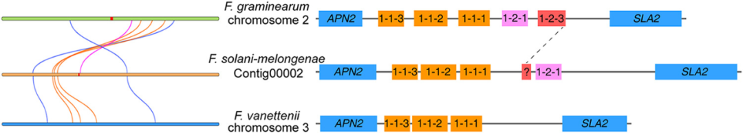 其他三種密切相關(guān)的 FSSC 物種F. falciforme、F. solaniF. vanettenii的基因組被用作參考基因組來探索 CRI 24-3 的選擇壓力。分別確定了 CRI 24-3 與?F. falciformeF. solani?F. vanettenii?之間的 2265、2272 和 2272 直系同源物對的非同義替換率 (Ka) 與同義替換率 (Ks) 的比率( 圖 6C 至 E)。Ka /Ks總體分析的值小于 1,表明 CRI 24-3 中的大多數(shù)直系同源物似乎都經(jīng)過了純化選擇并且高度保守。然而,CRI 24-3 和F. falciforme基因組的比較確定了一個快速進(jìn)化基因?qū)Γ‥VM0014458.1 與 GE10416_g)的 Ka /Ks比率大于 1,表明陽性選擇可能發(fā)生在進(jìn)化?;蚪M共線性分析表明,F. vanetteniiF. oxysporum基因組中的幾個染色體片段在 CRI 24-3 中濃縮成一個片段,并有一些倒位(圖 6F )。此外,CRI 24-3 中的一些直系同源物具有多對一的關(guān)系。CRI 24-3 中至少有兩個查詢基因與參考物種中的相同直系同源物匹配。值得注意的是,CRI 24-3 的重要基因組區(qū)域不能與尖孢鐮刀菌基因組中的那些共線性耦合,由 35.9% 的共線性率(共線直系同源物對與所有直系同源物對的比率)支持,該比率低于CRI 24-3 和F. vanettenii?(77.6%)。結(jié)果表明,CRI 24-3在系統(tǒng)發(fā)育上與尖孢鐮刀菌相距較遠(yuǎn)。MAT基因座對于在鐮刀菌屬中產(chǎn)生子囊孢子至關(guān)重要。在此,交配型結(jié)構(gòu)組織 ( MAT ) 基因座在基于簡化的共線性分析比較了茄科鐮孢菌CRI 24-3、禾谷鐮刀菌PH-1 和F. vanettenii?77-13-4(圖 7)。與僅攜帶 MAT1-1 基因的?F. vanettenii?77-13-4相比, CRI 24-3 含有MAT1-1和MAT1-2獨特型基因,在單個MAT基因座處與禾谷鐮刀菌密切相關(guān),除了 CRI 24-3 是 MAT1-2-3 缺陷型。只有位于 CRI 24-3 中 MAT1-2-1 上游區(qū)域的沒有任何特征功能域的片段與禾谷鐮刀菌中的 MAT1-2-3 具有序列相似性。