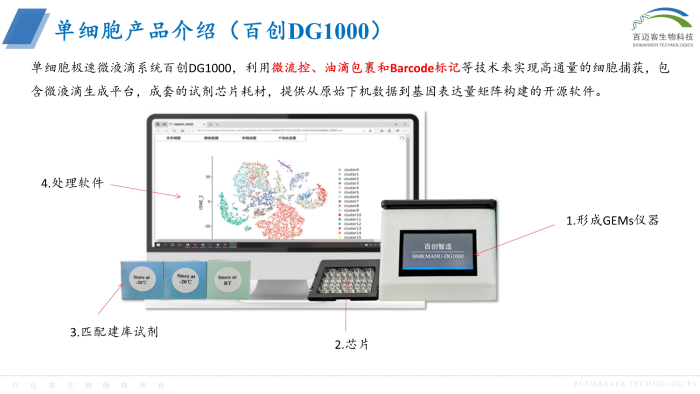 單細(xì)胞極速微液滴系統(tǒng)百創(chuàng)DG1000,利用微流控、油滴包裹和Barcode標(biāo)記等技術(shù)來實現(xiàn)高通量的細(xì)胞捕獲,包含微液滴生成平臺,成套的試劑芯片耗材,提供從原始下機(jī)數(shù)據(jù)到基因表達(dá)量矩陣構(gòu)建的開源軟件。
