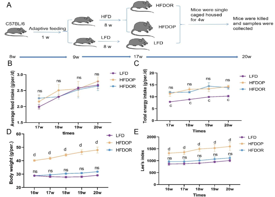 高脂飼料喂養(yǎng)8周后,單籠飼養(yǎng)4周,高脂飲食誘發(fā)的肥胖組(HFDOP)小鼠體重和Lee‘s指數(shù)持續(xù)增加,而肥胖抵抗組(HFDOR)小鼠體重和Lee’s指數(shù)持續(xù)增加。然而,HFDOP和HFDOR小鼠的平均每日飼料和能量攝入量沒有顯著差異(圖1B、C)。高脂飲食組與高脂飲食組小鼠體重和Lee‘s指數(shù)有統(tǒng)計(jì)學(xué)差異。HFDOP組的空腹血糖水平高于HFDOR組和LFD組(圖1G)。HFDOP組的肝臟重量、總脂肪和總內(nèi)臟脂肪的重量顯著高于LFD組(圖1H-J).